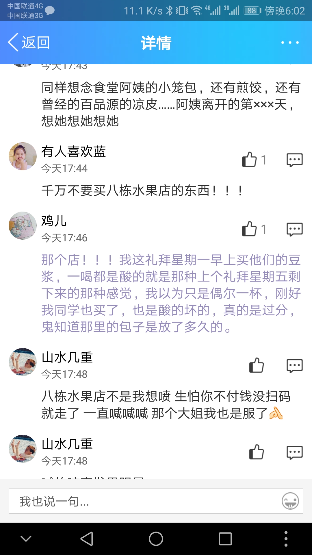 | 内容: | 湖南理工学院南院八栋宿舍楼下的水果店(图中的水果店),长期出售腐败变质的早餐和水果,这在广大师生中已经不是秘密。但是这些年来这个水果店只被封过一次,随后继续开业。这个水果店在师生中口碑极差,向学校举报几乎无果,我们只能每年向大一新生们说明,不要购买此店中的食品,但仍然有很多新生购买到了变质的、酸了的包子或是腐烂的散装水果。 希望政府能仔细的调查这家水果店,并给学院广大师生们一个公道,让学生们吃到放心的食品和水果,不要再让学生们和水果店或校方的激化矛盾。 万分感谢。 附件1:uploadfiles/201804/20180424191341479.jpg |