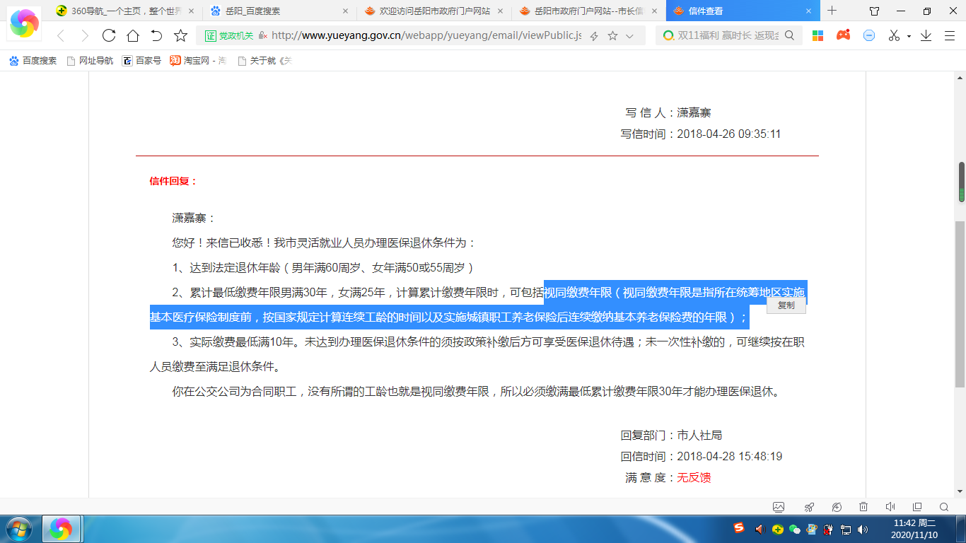 您好!我要咨询灵活就业医保的退休条件,如图所示,在市长信箱上,有关部门对灵活就业人员医保退休条件这样回复的: