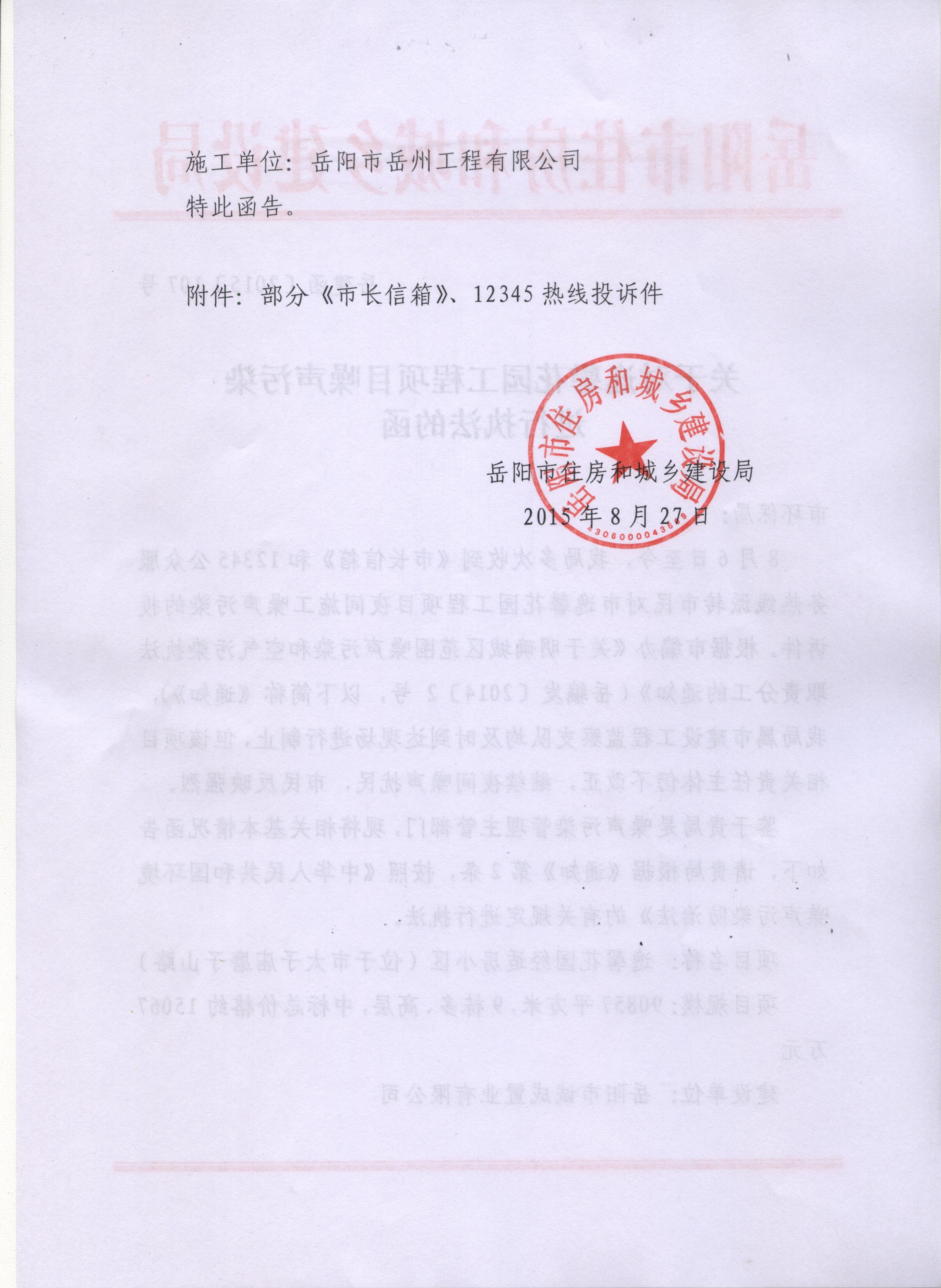 | 回复内容: | “嬷嬷小生”同志: 您好!关于逸馨花园项目噪声扰民的问题,我局根据市编办《关于明确城区范围噪声污染和空气污染执法职责分工的通知》(岳编办发[2014]2号)文件要求,向市环保局送达《关于对逸馨花园工程项目噪声污染进行执法的函》(岳建函[2015]107号),具体内容详见附件(扫描件)。 特此回复。 岳阳市住房和城乡建设局 2015年8月27日