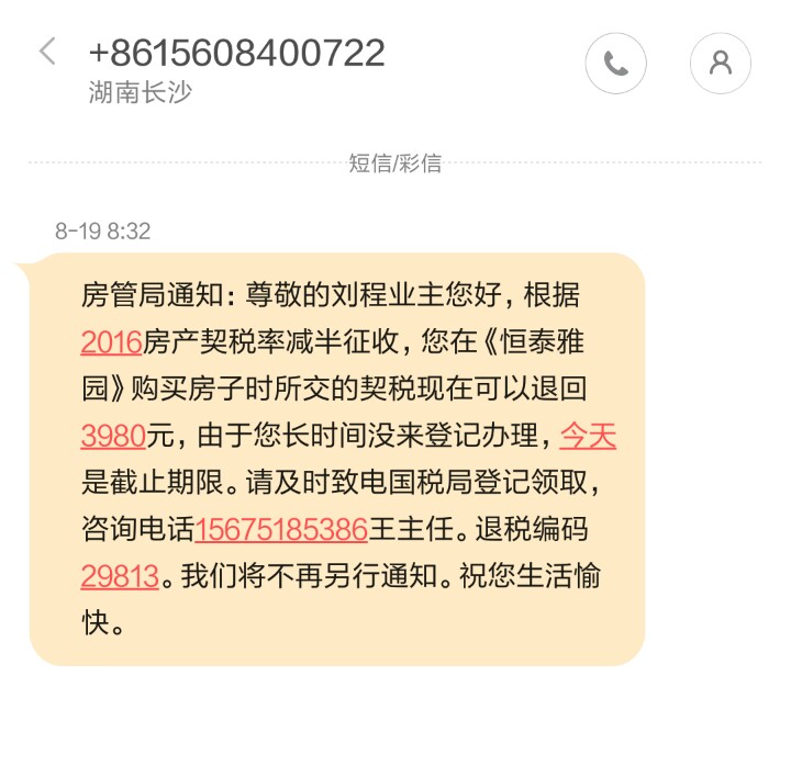 您好! 对您咨询的问题回复如下: 当前,购房享受契税优惠的具体政策为:2月19日,财政部、国家税务总局、住房城乡建设部三部门联合发布《关于调整房地产交易环节契税、营业税优惠政策的通知》(财税〔2016〕23号)。《通知》明确:个人购买家庭唯一住房(家庭成员范围包括购房人、配偶以及未成年子女,下同),面积为90平方米及以下的,减按1%的税率征收契税;面积为90平方米以上的,减按1.5%的税率征收契税。个人购买家庭第二套改善性住房,面积为90平方米及以下的,减按1%的税率征收契税;面积为90平方米以上的,减按2%的税率征收契税。《通知》自2016年2月22日起执行。凡是于2016年2月22日及以后到税务机关申报缴纳房地产交易契税、符合《通知》规定税收优惠条件的,均可享受优惠税率。如果已在 2016年2月22日之前向税务机关申报缴纳房地产交易契税,不适用本通知规定,不能退税。 您收到的短信为电信诈骗信息,契税由地税部门征管,不属国税部门征收,且地税部门不会以私人手机号码短信通知的形式发送涉税信息,请勿上当。如您对涉税事宜有疑问,为了您更快获得解答,欢迎致电12366热线咨询。 岳阳市地方税务局 2016年8月29日 |